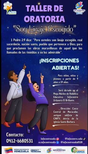 Dirigido a niños, niñas y jóvenes de 9 a 19 años. Será dictado en el Mega núcleo de robótica educativa en el Infocentro Urdaneta «El Brillante».